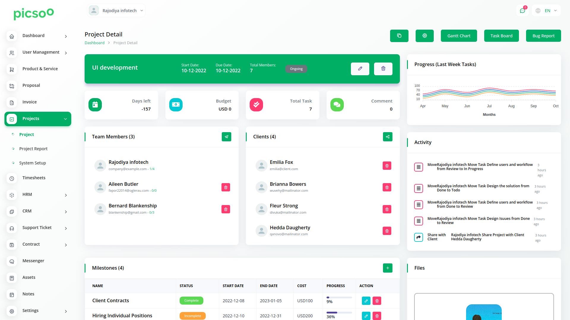 Ajoutez des coûts et un résumé aux étapes et modifiez le statut à l'aide du menu déroulant. Vous pouvez consulter les activités récentes d'un projet ainsi qu'un graphique sur l'avancement du projet. En outre, vous pouvez vérifier les détails de vos tâches dans les détails du projet à l'aide du diagramme de Gantt.