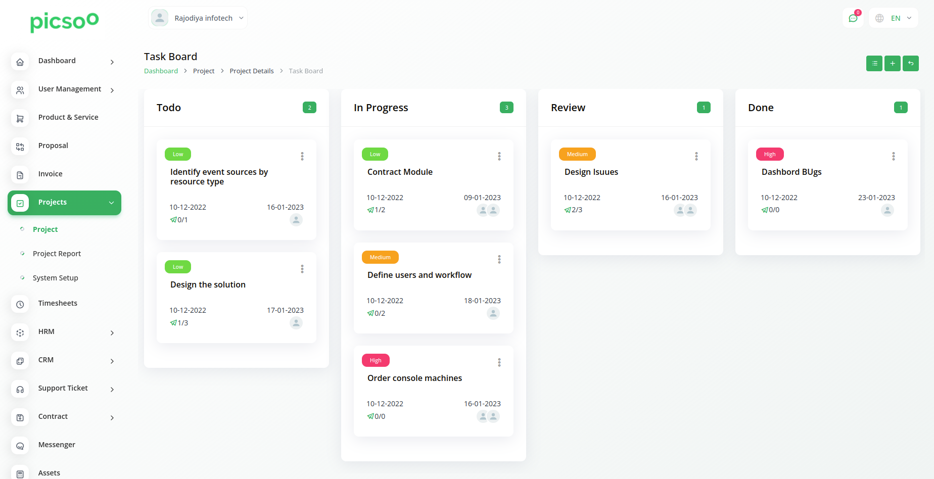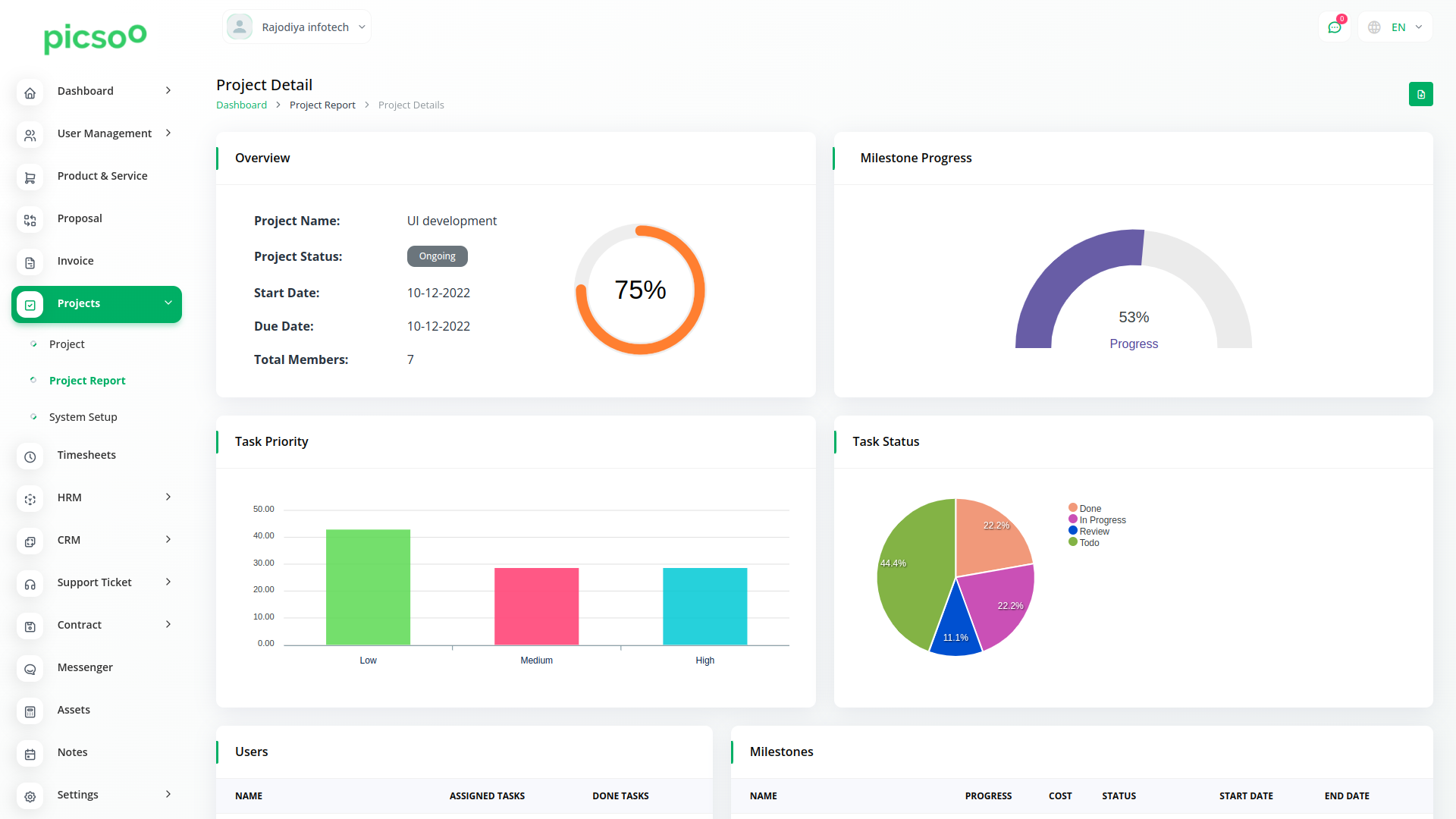 Obtenez une vue d'ensemble du nombre total de projets, de tâches, de bogues et de membres. Une représentation visuelle de l'aperçu des tâches et de l'état du projet peut vous aider à évaluer l'avancement de chaque tâche. Enfin, vous pouvez vérifier la tâche la plus échue.