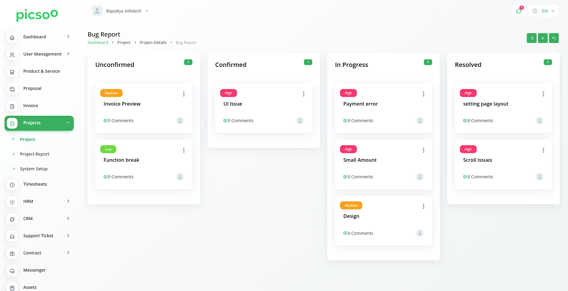 Créez de nouveaux bogues et attribuez-leur des utilisateurs et une priorité. Vous pouvez écrire une note dans la zone de texte pour la description du bogue. De plus, le statut de chaque bogue peut être modifié à l'aide d'une liste déroulante et d'un système de glisser-déposer Kanban.